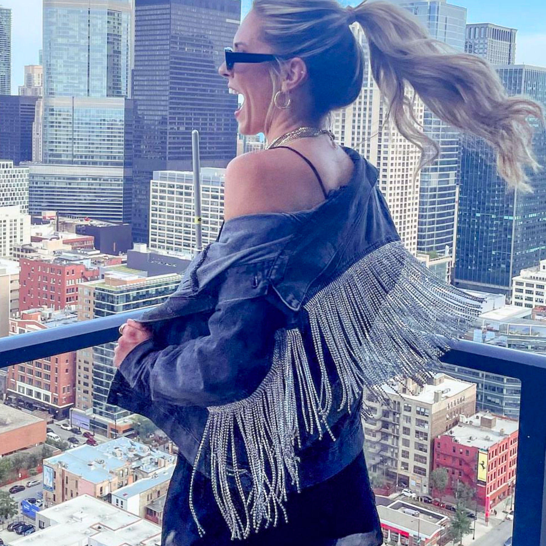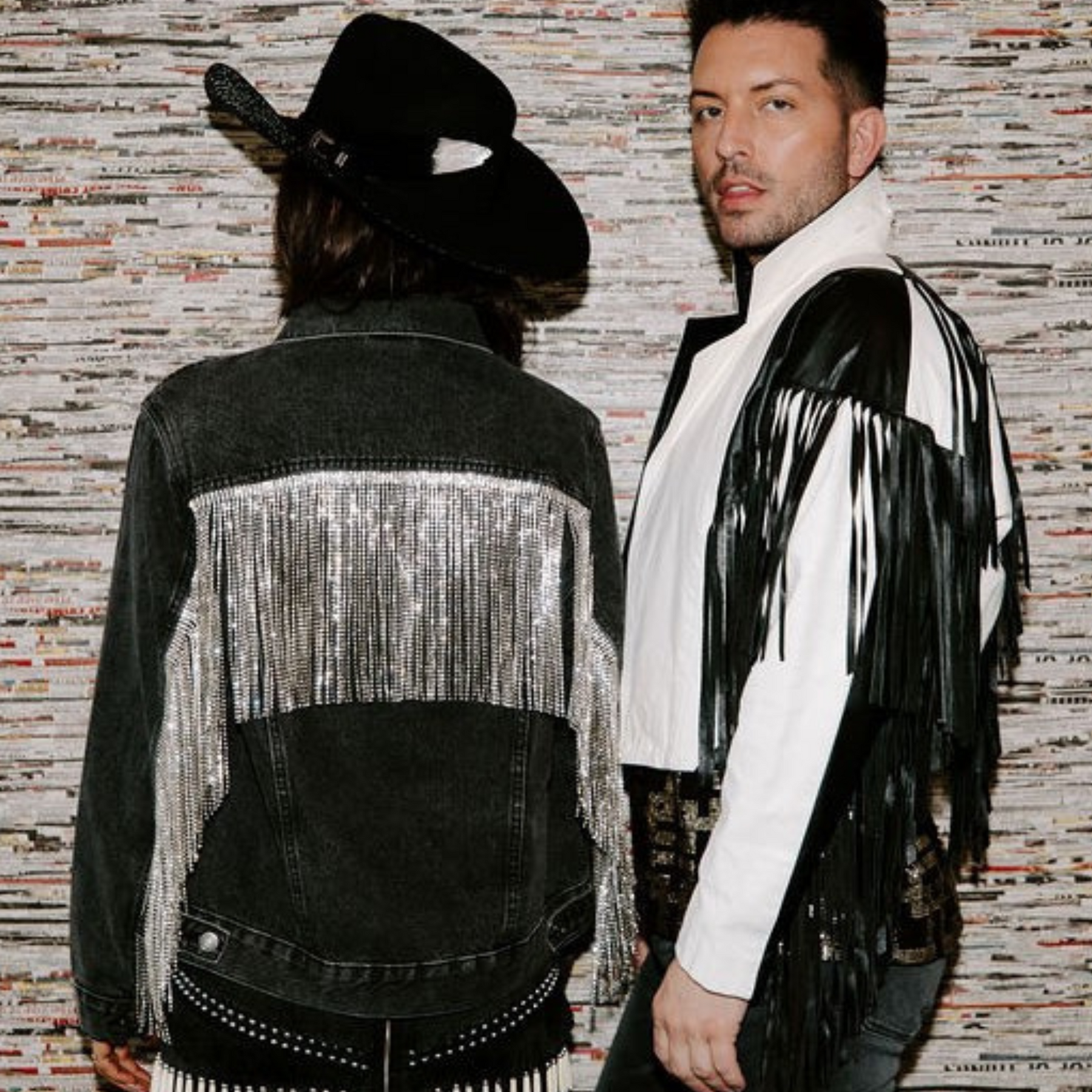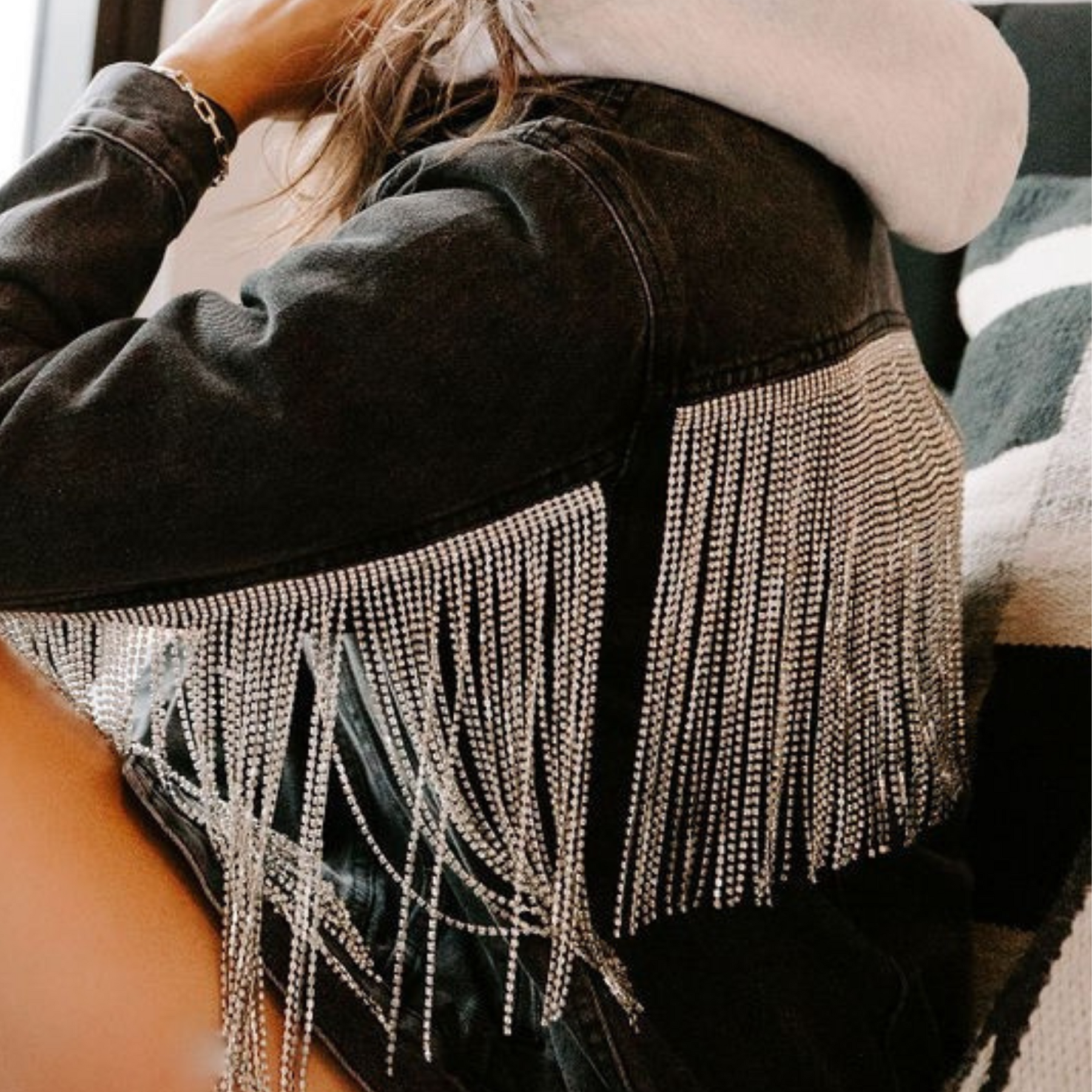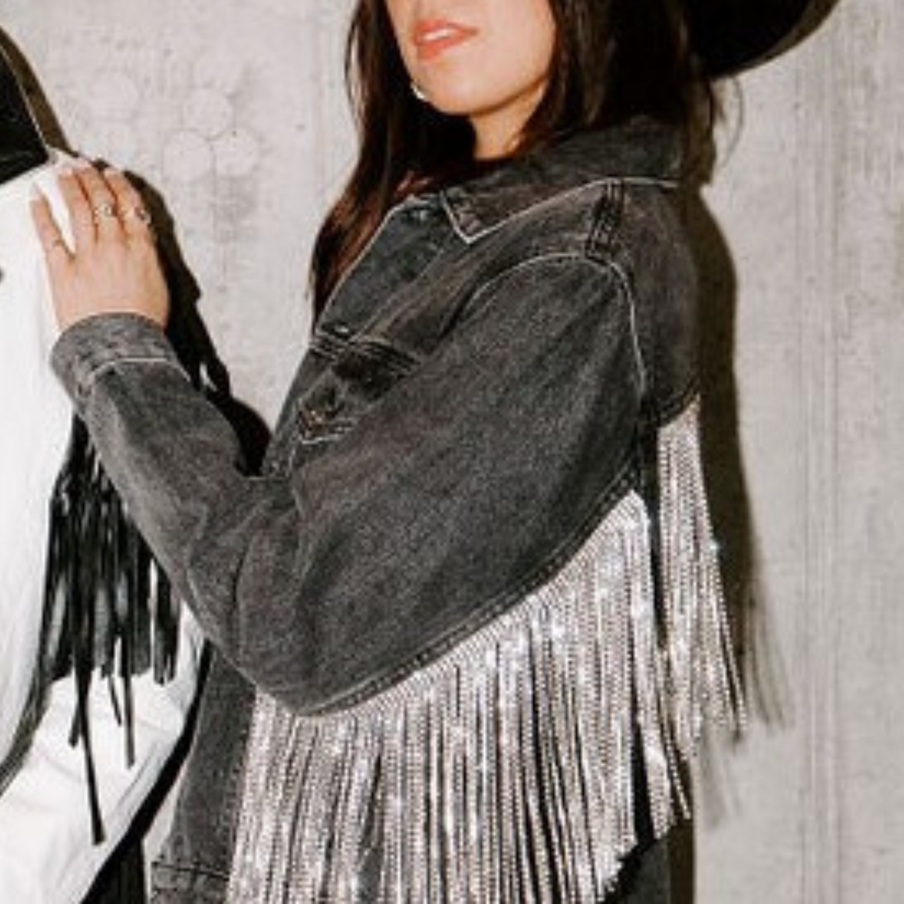 We recommend having a professional dry cleaner spot clean your jacket to avoid damage to the fringe. Each jacket comes with extra rhinestones, should you party too hard and lose one.