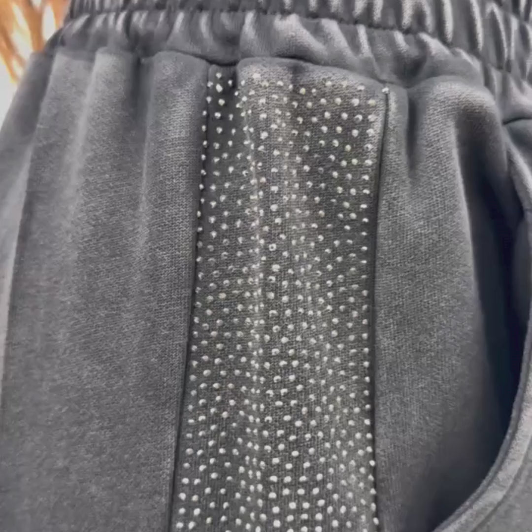 These cozy sweatpants featuring rhinestone accents deliver sparkle without compromising comfort. Perfect for travel days or for a laid-back look after a workout.
