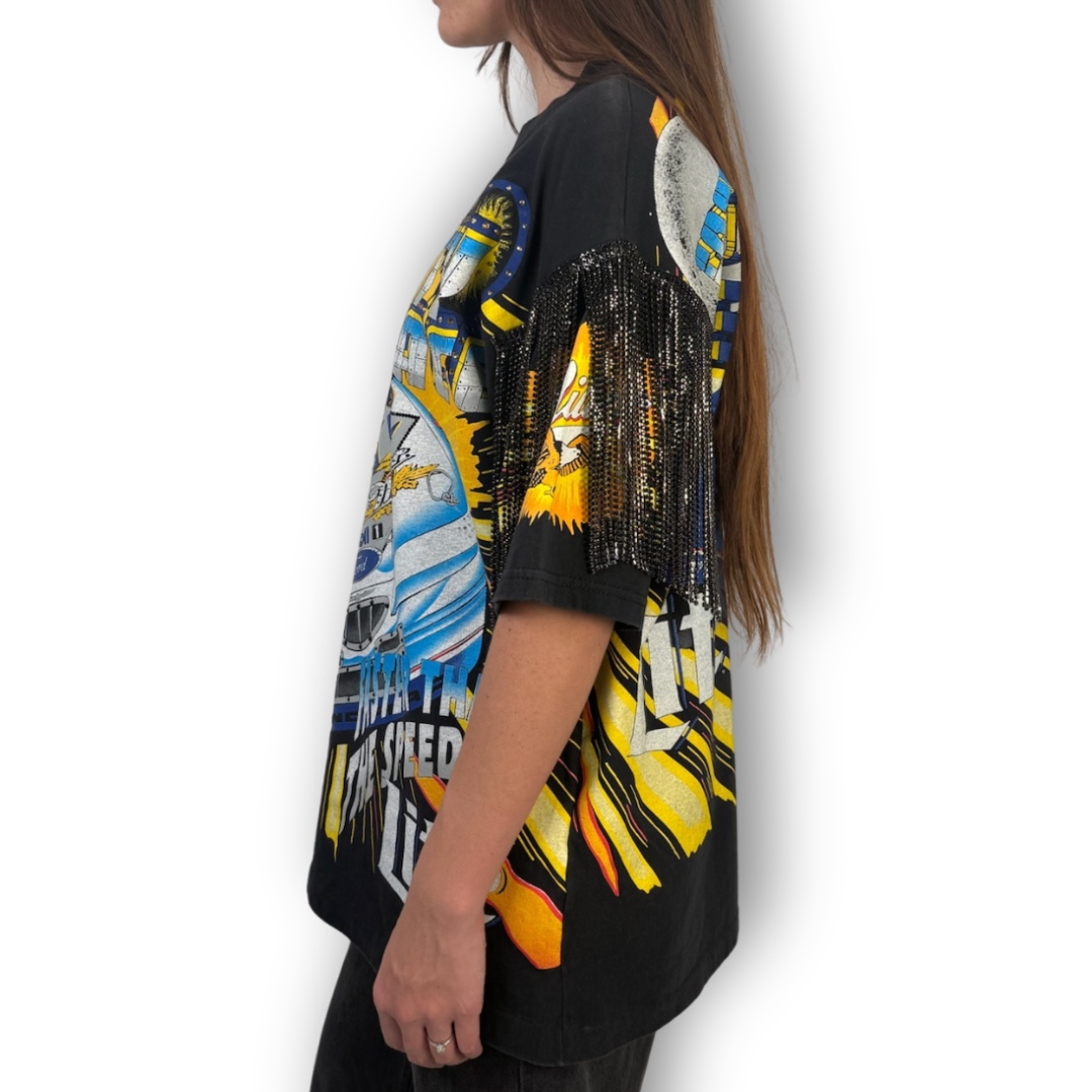 OUR VINTAGE TSHIRTS ARE HANDMADE IN LOS ANGELES USING PREMIUM RHINESTONE FRINGE PIECES.