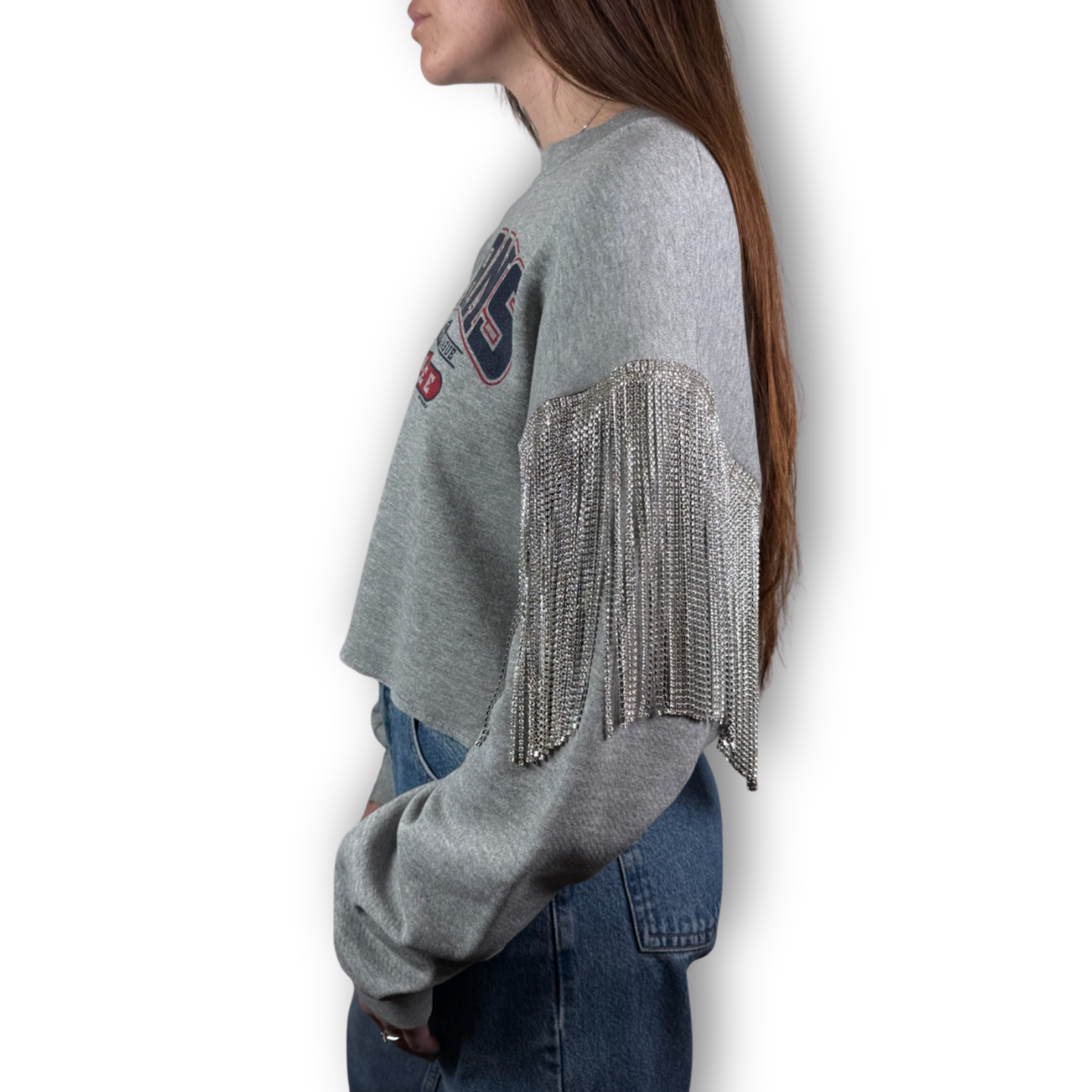 OUR VINTAGE SWEATSHIRTS ARE HANDMADE IN LOS ANGELES USING PREMIUM RHINESTONE FRINGE PIECES.