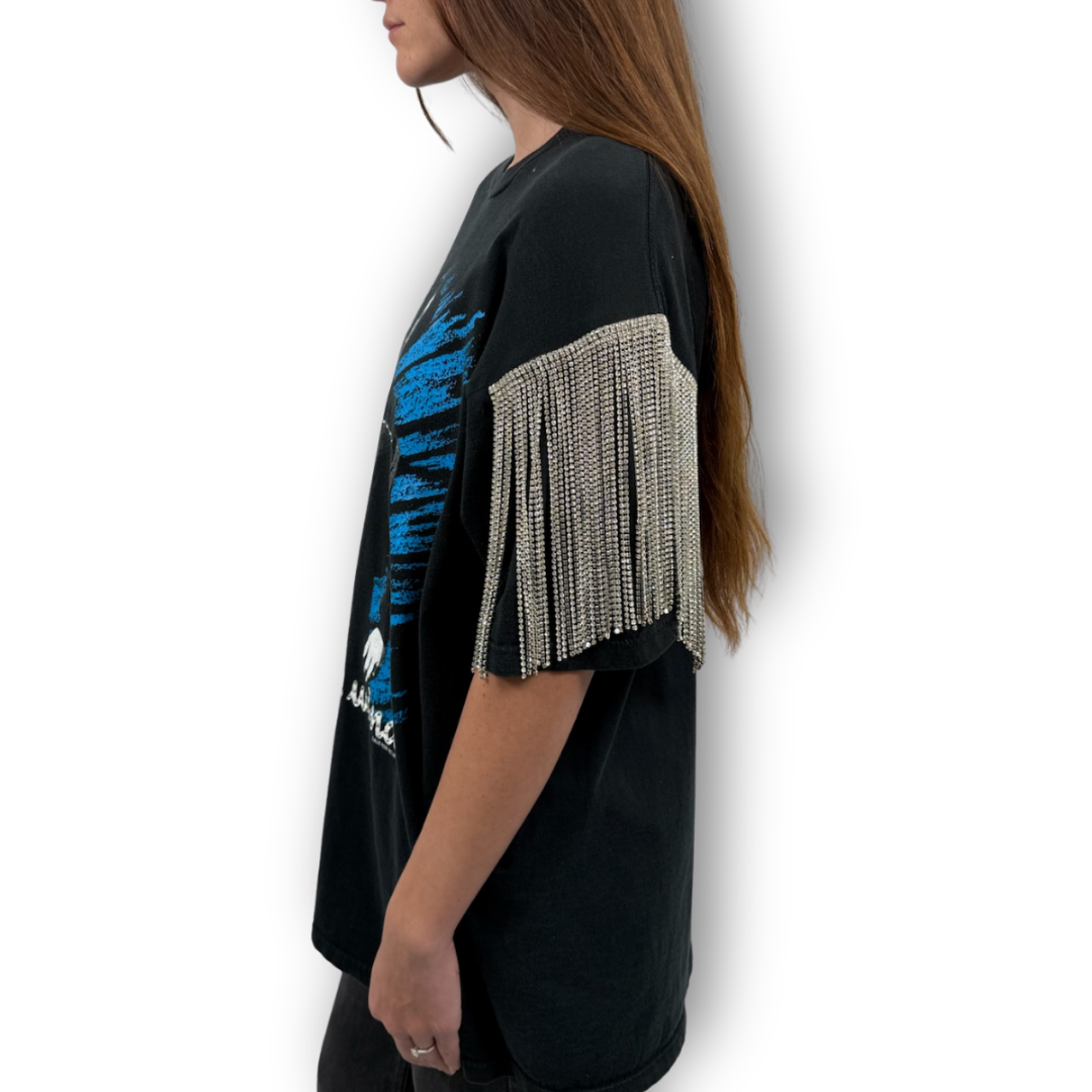 OUR VINTAGE TSHIRTS ARE HANDMADE IN LOS ANGELES USING PREMIUM RHINESTONE FRINGE PIECES.