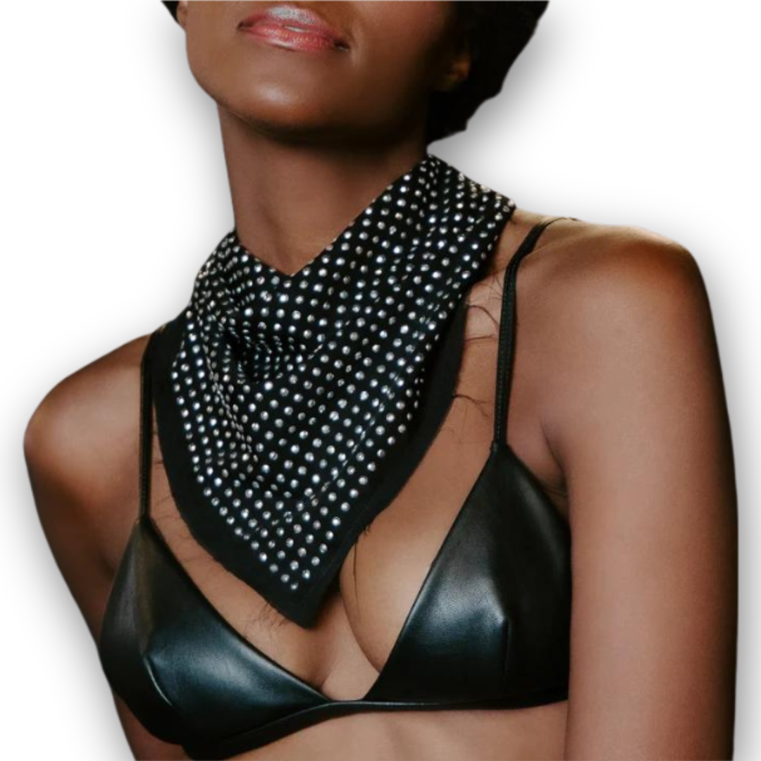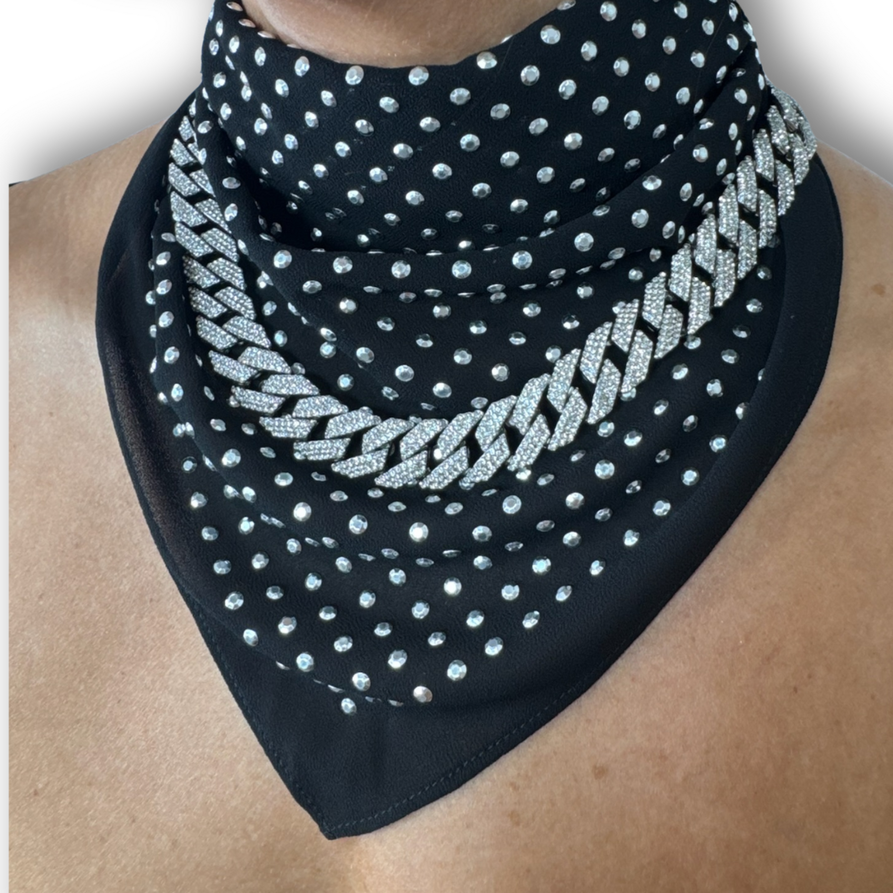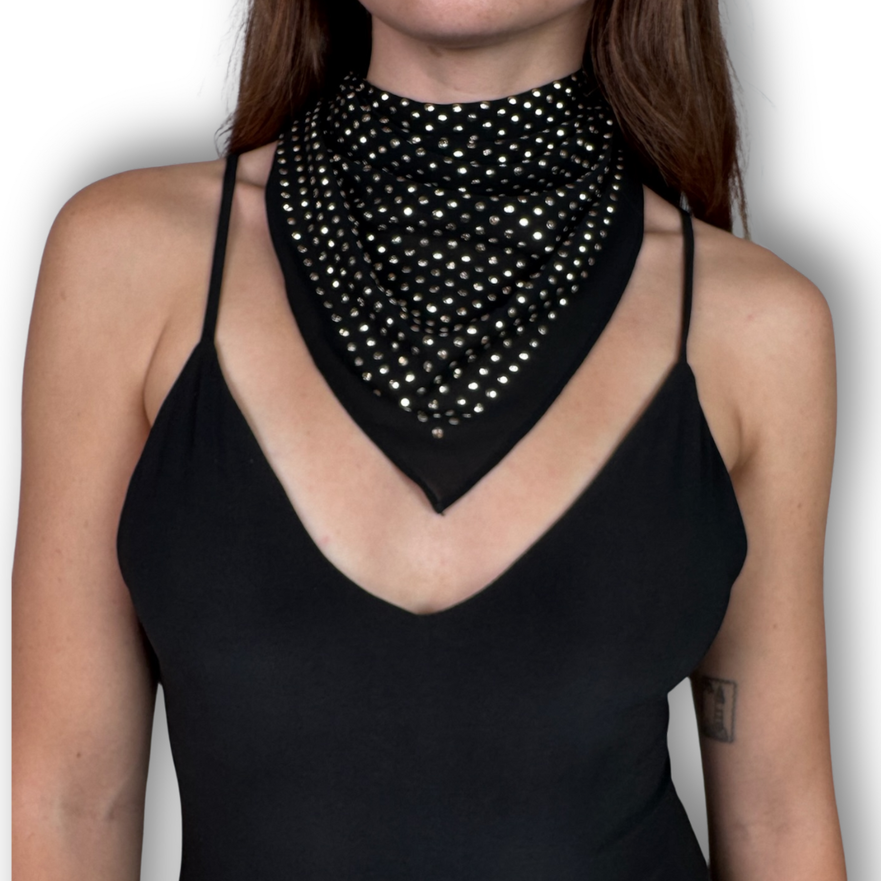 Add a touch of Daniel Diamond to your outfit with our rhinestoned silk neck scarf. Designed for all of our bandana lovers who crave a little extra sparkle. Tie it around your neck, your hat, or even around your favorite bag handle. True to our vintage-inspired collections, its raw edge is sealed off with a finishing seam to further expand our vintage look.